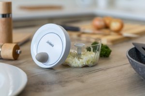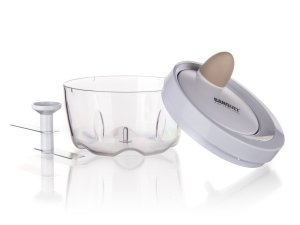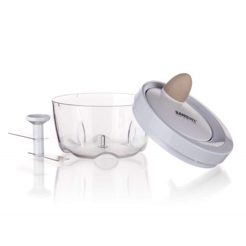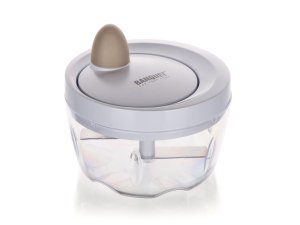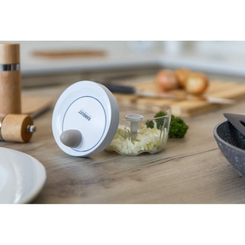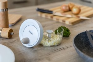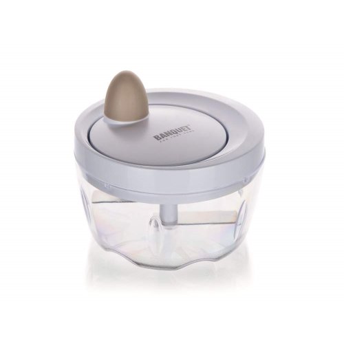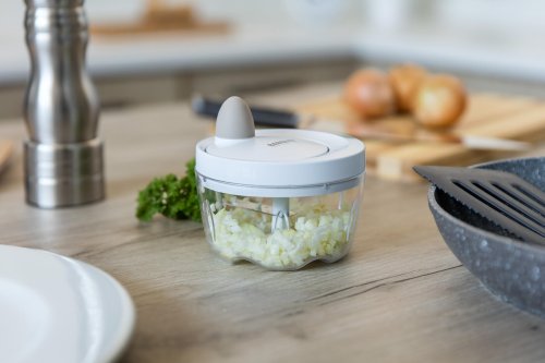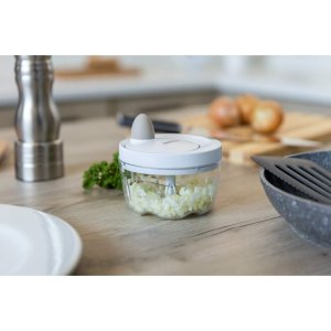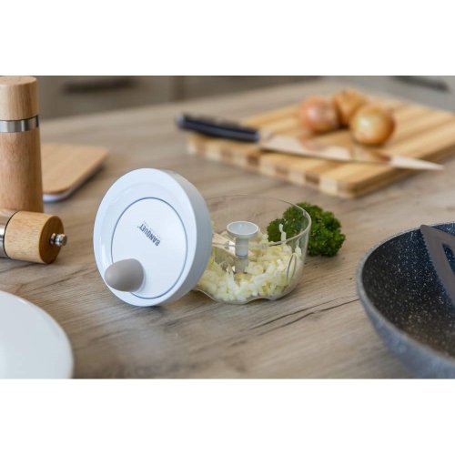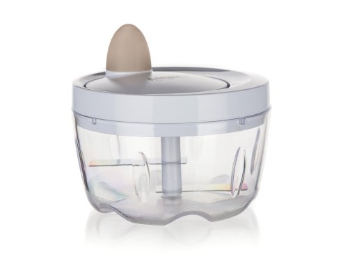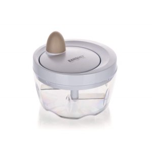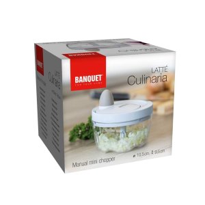 Ručný minisekáčik CULINARIA Latte s plastovou transparentnou miskou s priemerom 10,5 cm a nerezovými nožmi. Ostré nerezové nože nasekajú ovocie a zeleninu na malé kusy. Jednotlivé diely sekáčika sa ľahko udržujú.