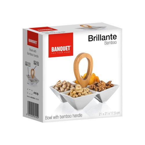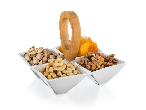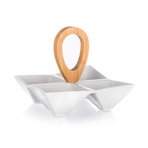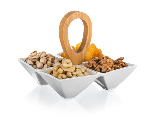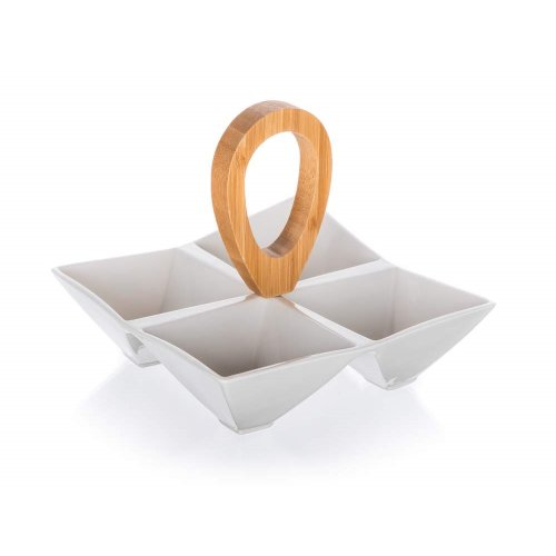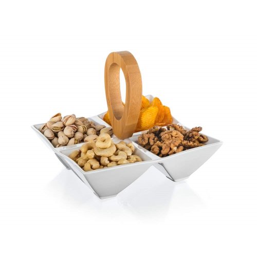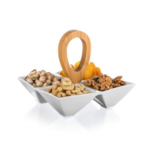 Štyri Hranaté delené porcelánové misky, s bambusovým držiakom, s celkovými rozmermi 21 x 21 x 17,5 cm. Miska je ideálna na servírovanie rôznych druhov orieškov, sušeného ovocia, olív a pod.