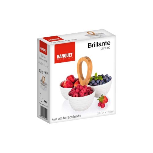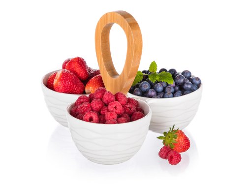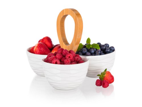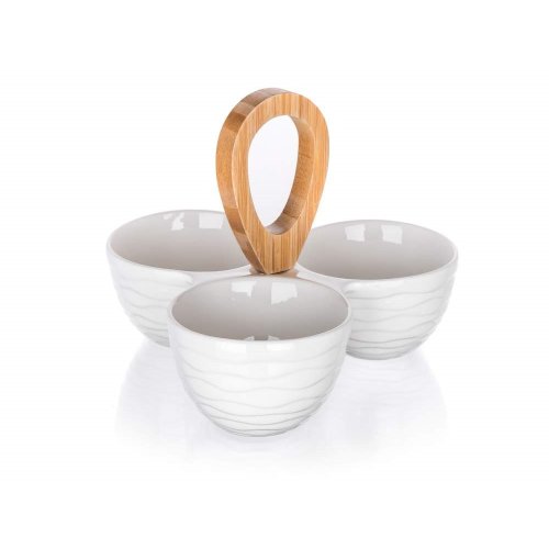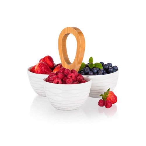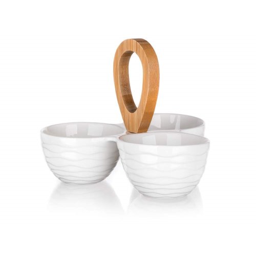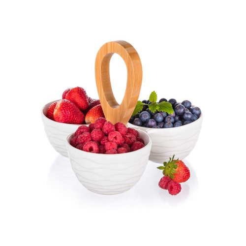 Tri okrúhle delené porcelánové misky, s bambusovým držiakom, s celkovými rozmermi 24 x 24 x 18,5 cm. Miska je ideálna na servírovanie rôznych druhov orieškov, sušeného ovocia, olív a pod.