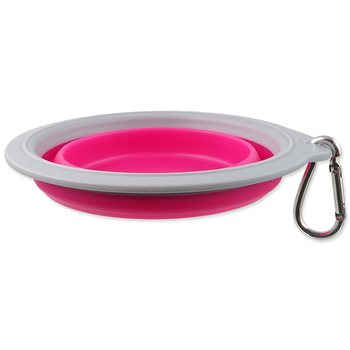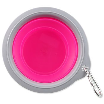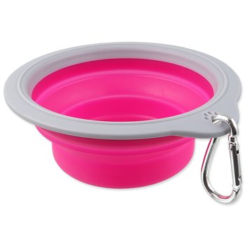 Cestovná miska skladacia. Vyrobená z odolného materiálu silikónu, ľahko zložiteľná do kompaktných rozmerov. Vhodná na cesty a dlhé prechádzky. Neprijíma pachy a ľahko sa udržuje. Odolná proti nárazom a mrazu. Obsahuje karabínu na uchytenie na batoh alebo oblečenie.
