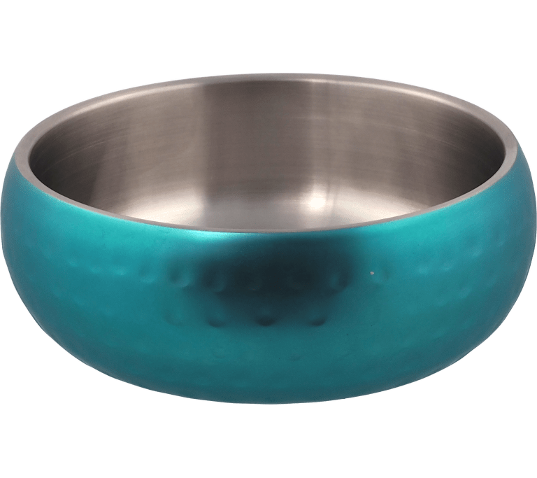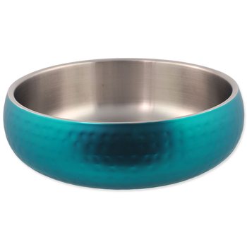 Elegantná nerezová miska s dvojitou stenou v modernom tyrkysovom prevedení . Vďaka špeciálnej konštrukcii udržuje stabilnú teplotu vody alebo krmiva a zároveň pôsobí luxusne v každom interiéri.