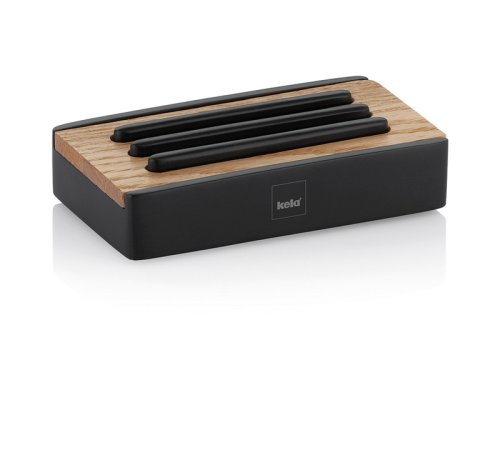 Elegantné kúpeľňové doplnky s moderným vzhľadom: mydlenka Cube z čierneho plastu s jednoduchou údržbou v kombinácii s dubovým drevom. 3 vyvýšené drážky dodávajú mydlovke pútavý vzhľad a mydlo môže lepšie ležať. Mydelnička je 12 cm dlhá, 7 cm široká a 3 cm vysoká. Polyresin, matná čierna, dubové drevo 12x7cm, 3 cm v