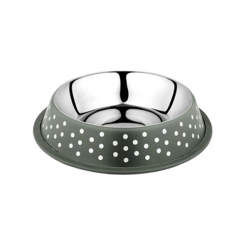 Miska Duvoplus Deco Fix na krmivo alebo vodu pre psov a mačky je vyrobená z brúsenej nerezovej ocele. Spodný okraj má gumový lem, aby miska na podlahe nekĺzala a nerobila hluk. Štýlový vzhľad jej dodáva moderná potlač s bodkami. Vhodná iba na ručné umývanie. Rozmery (cca): Ø 32,3 × 6,1 cm Objem: 2,1 l Materiál: nerezová oceľ Farba: strieborná, zelená, biela Vzor: bodky
