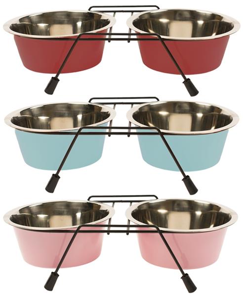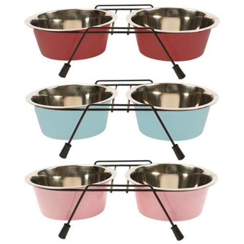 Dvojitá nerezová miska v praktickom stojane. Vhodné do umývačky. Vhodné na suché alebo mokré krmivo a vodu.