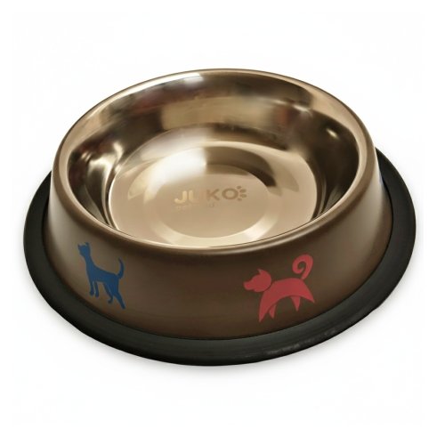 Hnedá nerezová miska s farebnými psíkmi po obvode. Miska je opatrená gumovým krúžkom, aby bola stabilná a nekĺzala po podlahe.