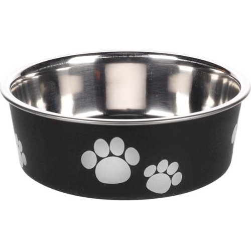 Odolná a hygienická nerezová miska je vhodná na suchú aj mokrú stravu alebo vodu. Snímateľný gumový krúžok na spodnej strane dna zabraňuje kĺzaniu a tlmí hluk. Misku bez gumového krúžku je možné umývať v umývačke. Farba: čierna s bielou labkou Objem: 300 ml