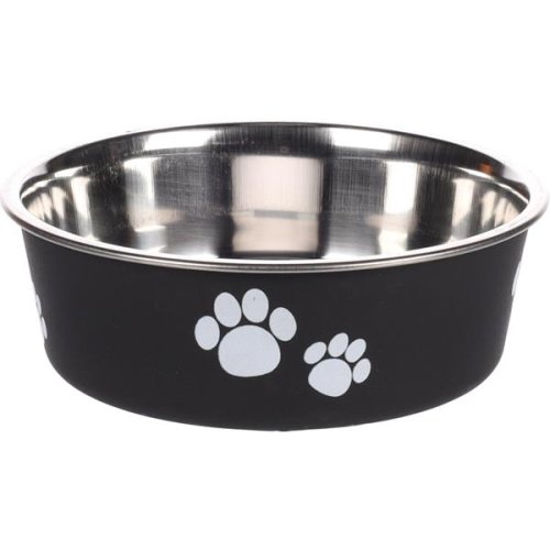 Odolná a hygienická nerezová miska je vhodná na suchú aj mokrú stravu alebo vodu. Snímateľný gumový krúžok na spodnej strane dna zabraňuje kĺzaniu a tlmí hluk. Misku bez gumového krúžku je možné umývať v umývačke. Farba: čierna s bielou labkou Objem: 450 ml