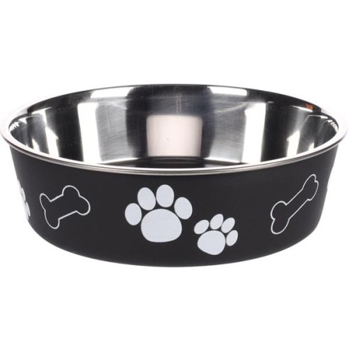 Odolná a hygienická nerezová miska je vhodná na suchú aj mokrú stravu alebo vodu. Snímateľný gumový krúžok na spodnej strane dna zabraňuje kĺzaniu a tlmí hluk. Misku bez gumového krúžku je možné umývať v umývačke. Farba: čierna s bielou labkou Objem: 800 ml