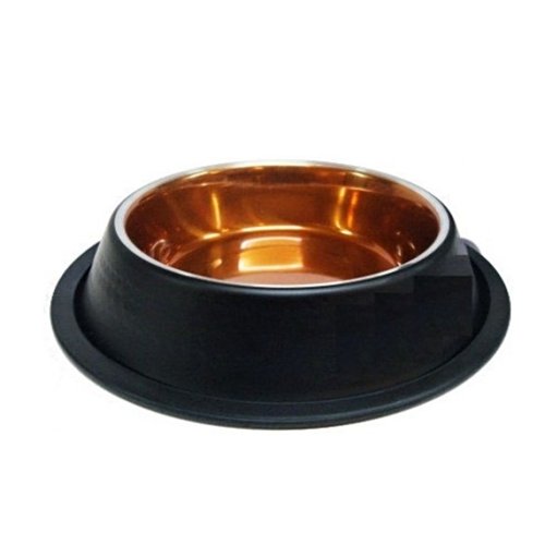 Nerezová miska vo veľmi netradičnom vzhľade. Kombinácia čiernej farby na vonkajšej strane a medené vo vnútri je netradičná a zaujímavá. Spodný okraj je opatrený gumou, aby miska nekĺzala po podlahe.