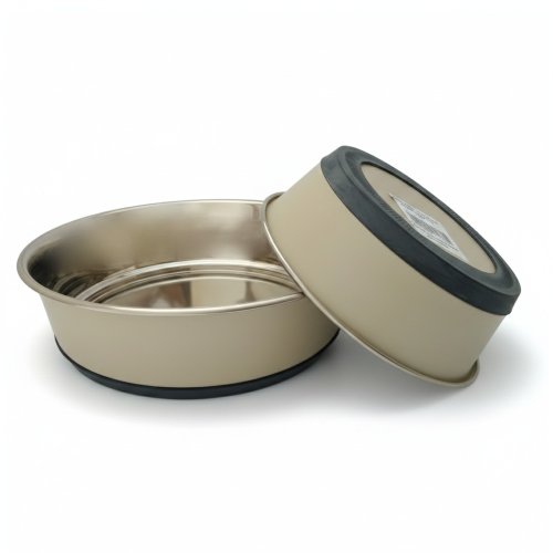 Nerezová miska s vyššou gramážou je odolná proti prevráteniu. Vďaka silikónovému krúžku v spodnej časti sa nešmýka po podlahe. Vonkajšia strana misky je v matnej béžovej farbe, vďaka čomu má miska zaujímavejší a štýlový vzhľad.