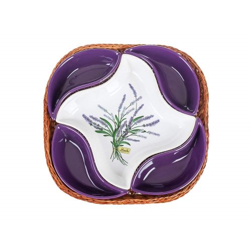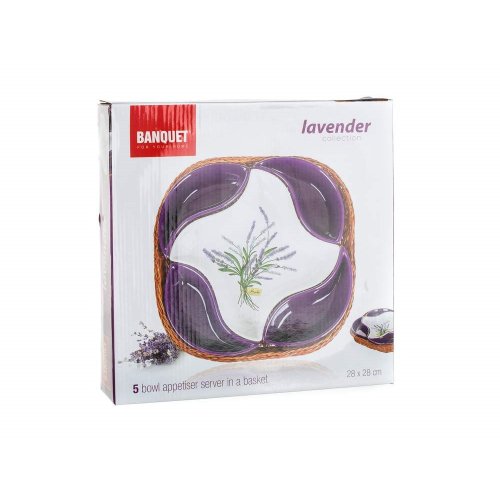 sada obsahuje: 4 x malá fialová keramická miska 1 x veľká keramická miska s dekórom levandule 1 x prútený košík