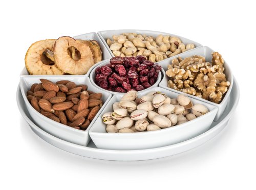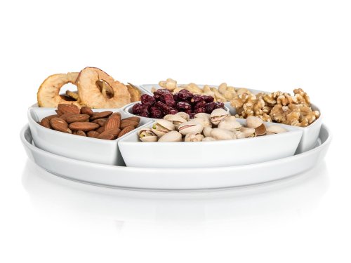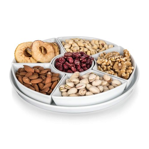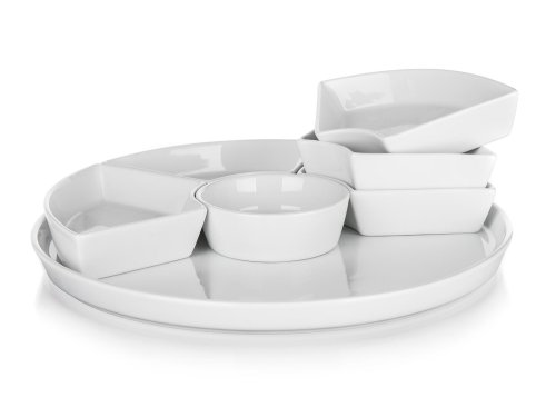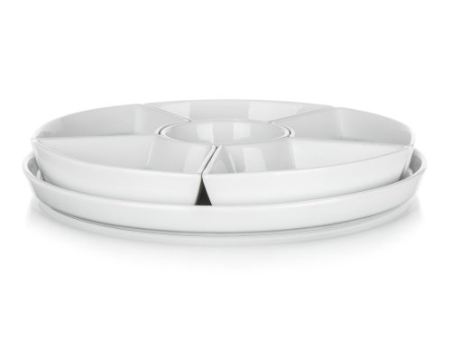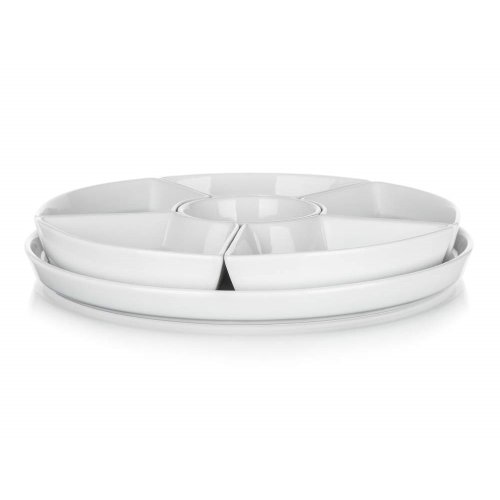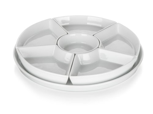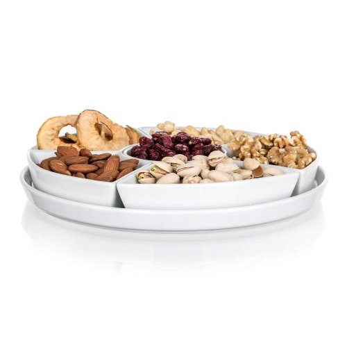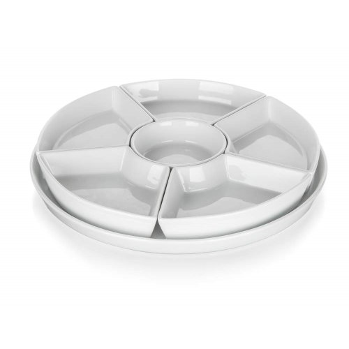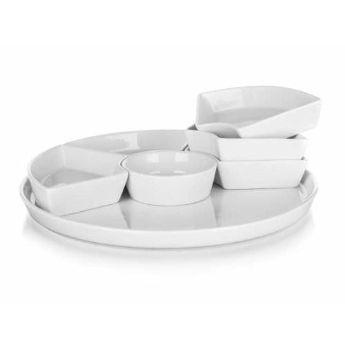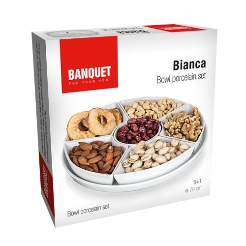 Servírovacia sada guľatá porcelánová BIANCA v bielej farbe, sa skladá z okrúhleho podnosu a 6 mištičiek rôzneho tvaru. Táto sada má široké využitie. , marmelády, sypanie, oriešky, ovocie alebo zeleninu. Vhodné na každodenné použitie. Sada je vhodná do umývačky riadu.