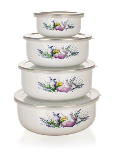 Sada smaltovaných misiek s plastovými vekami LAVENDER. Misky sú určené iba na uchovávanie potravín, nie sú určené na varenie.