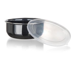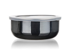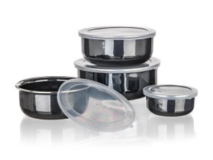 Sada smaltovaných misiek s plastovými vekami METALIC Black. Misky sú určené iba na uchovávanie potravín, nie sú určené na varenie.