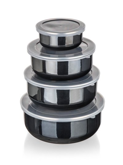Miska sada 8diel. (10, 14, 16, 18 cm + 4 viečka) smalt METALIC Black. sada obsahuje misky: - pr. 10 cm, objem 0,2 l – pr. 14 cm, objem 0,6 l - pr. 16 cm, objem 0,9 l - pr. 18 cm, objem 1,3 l materiál: …