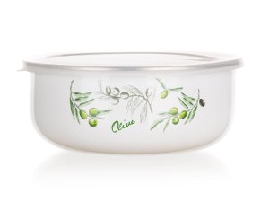 materiál: smalt, plastové viečko hrúbka steny: 0,2 mm farba: biela dekor: olivy