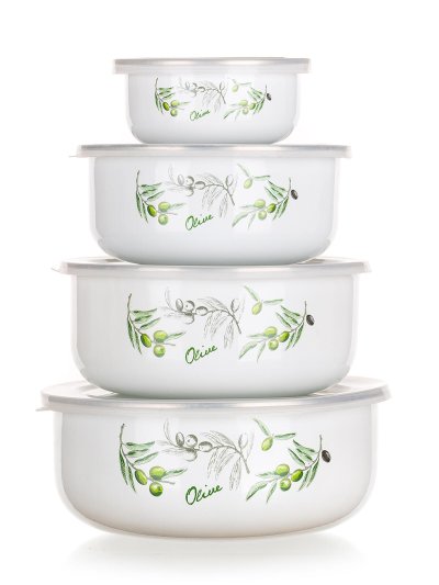 Miska sada 8diel. (10, 14, 16, 18 cm + 4 viečka) smalt OLIVES. sada obsahuje misky: - pr. 10 cm, objem 0,2 l - pr. 14 cm, objem 0,6 l - pr. 16 cm, objem 0,9 l - pr. 18 cm, objem 1,3 l materiál: smalt, …