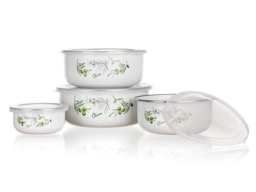 Sada smaltovaných misiek s plastovými vekami OLIVES. Misky sú určené iba na uchovávanie potravín, nie sú určené na varenie.