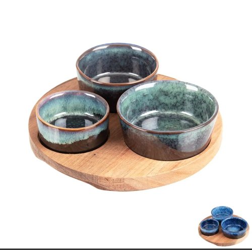 Sada 3 kameninových misiek s veľmi zaujímavou glazúrou na akáciovej tácke ozvláštni servírovanie a podávanie pohostenia. Skvele sa hodí na zemiačiky, olivy, chrumky, praclíky, syry, údeninu, krekry alebo tiež na servírovanie zeleniny a dipov. Mix 2 farieb glazúry. Priemer 1. misky 7 cm, výška. 3.3 cm, objem 80 ml. Priemer 2. misky 8.5 cm, výška 4 cm, objem 160 ml. Priemer 3. misky 10 cm, výška 4 cm, objem 180 ml. Akáciová tácka s priemerom 20 cm, výška 1.5 cm. V umývačke je možné umývať iba misky. Nie je vhodné do MVT. EAN 8720573351799