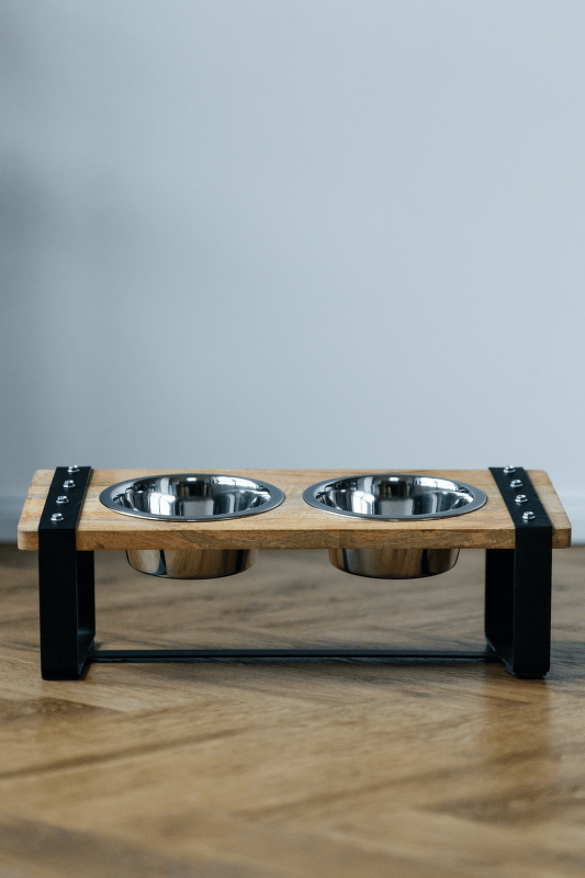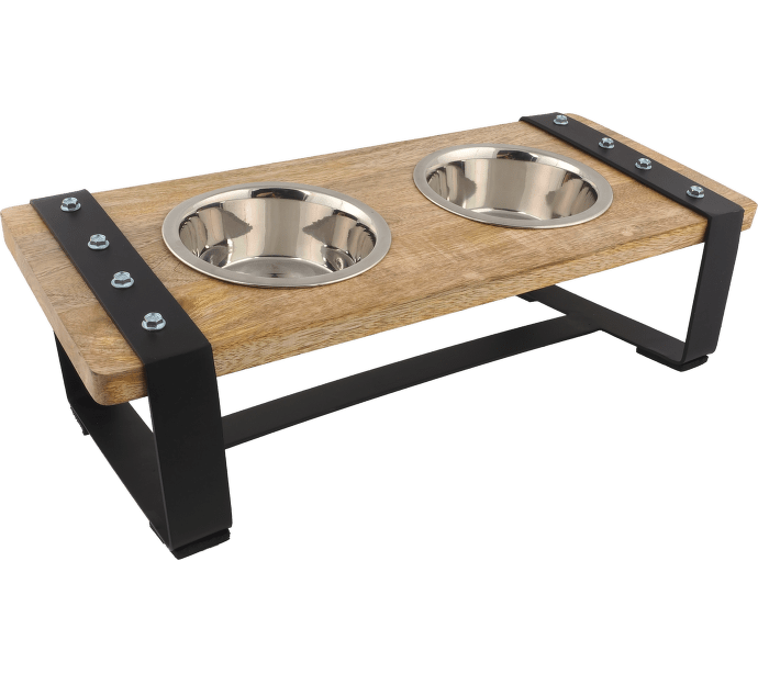 Praktická sada dvoch nerezových misiek v elegantnom drevenom stojane so železnou konštrukciou. Ideálne riešenie pre podávanie vody aj krmiva , ktoré spája funkčnosť a moderný dizajn .