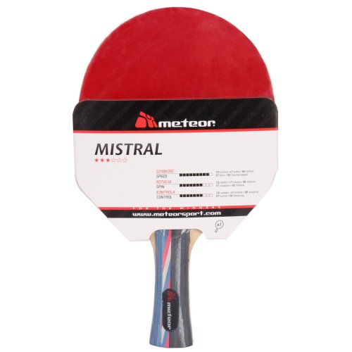 Raketa na stolný tenis Meteor Mistral*** je vhodná pre rekreačných hráčov aj pre skúsenejších a pokročilých hráčov . Rakety Mistral*** sú vyrobené z kvalitných materiálov – dreva, PU peny a gumy – ktoré zaručujú dobrú odolnosť a dlhú životnosť. Vďaka ergonomickému tvaru rukoväte sa raketa ľahko prispôsobí Vašej ruke. Rakety boli vyrobené pomocou najmodernejších technológií, vďaka ktorým tak budú spĺňať aj požiadavky náročnejších hráčov. Optimálna rýchlosť je dosiahnutá použitím elastickej gumy pre vynikajúcu kontrolu a trakciu. Drevená rukoväť zaručuje veľmi dobrý grip, vďaka čomu je raketa vhodná pre útočný štýl hry. Parametre: Rýchlosť: 9/10 Rotácia: 7/10 Kontrola: 7/10 Dĺžka rukoväte: 100 mm Šírka rukoväte: 33 mm Hrúbka hlavy: 12.5 mm Hmotnosť pálky: 168 g Plášť: 1.8 mm Vrstvy: 5 Farba