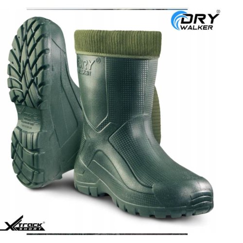 Celoročné čižmy s hrejivou vložkou DRY WALKER model Xtrack Short. Vyrobené z materiálu EVA, ktorý je odolný a pritom ľahký a úplne vodeodolný. Vnútri nachádza vyberateľná hrejivá vložka zakončená manšestrom. Špeciálna absorpčná podložka a protišmyková úprava v podrážke zvyšujú komfort používania. Je doplnený protektorom, ktorý zaisťuje dobrú priľnavosť na klzkom blatistom povrchu.