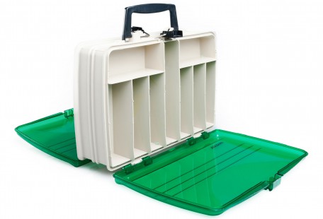 Praktická obojstranná krabička na rybársku bižutériu. Skvele sa hodí na uloženie háčikov, kŕmidiel, obratlíkov a ďalších nevyhnutných vecí. Je vyrobená z pevného plastu, ktorý vyrdží aj tvrdé podmienky pri prenášaní a pri vode.