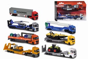 Nákladné auto s návesom, kovové, na voľnobeh, pohyblivé časti. Dĺžka cca 20 cm. Výber z 8 druhov: autotransportér MAN TGA XXL alebo MAN TGA XXL s loďou alebo s traktorom, 5x nákladné auto Mercedes-Benz (na prepravu zvierat, s ťahačom Maersk, s policajnou helikoptérou, s bagrom alebo s kontajnermi na triedený odpad).