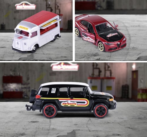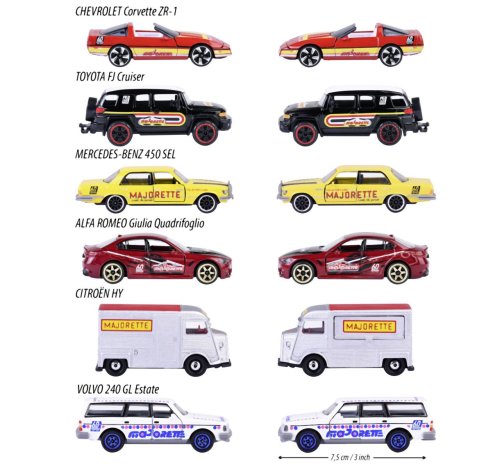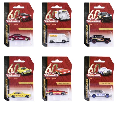 Prémiové kovové autíčko na oslavu výročia 60. rokov Majorette na voľnobeh. S viacerými otvárateľnými časťami (dvere/kapota). V kolekcii je 6 druhov autíčok: Citroen HY, Mercedes-Benz 450 SEL, Volvo 240 GL Estate, Chevrolet Corvette 1990 ZR-1, Toyota FJ Cruiser, Alfa Romeo Giulia Quadrifoglio. Dĺžka autíčka 7,5 cm. V mierke 1:64.