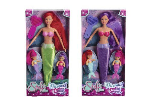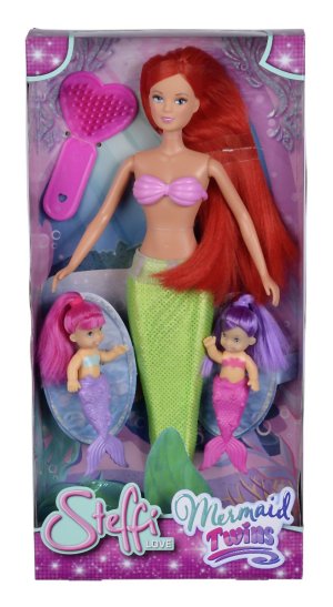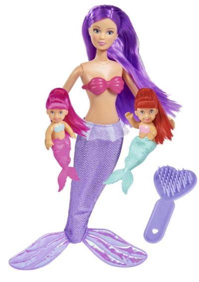 Bábika Steffi s malými morskými vílami, súčasťou je kefa na vlasy. Výška Steffi 29 cm, výška malých morských víl 7 cm, 2 druhy.