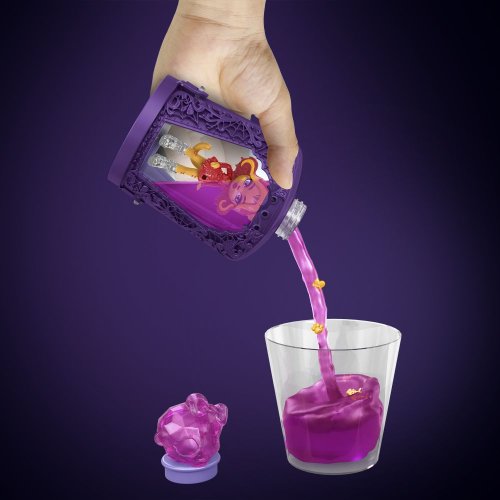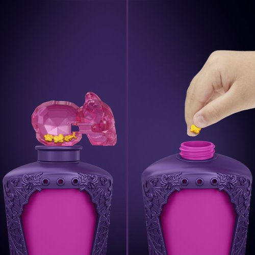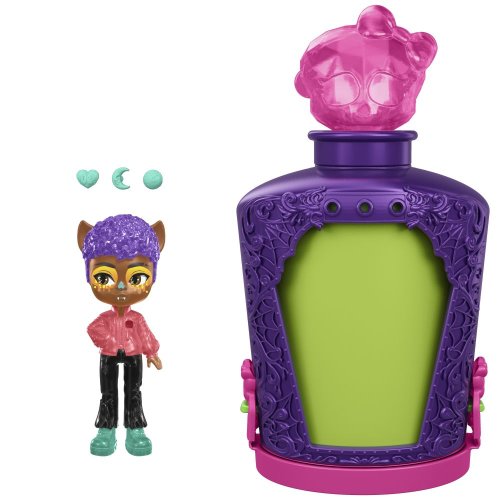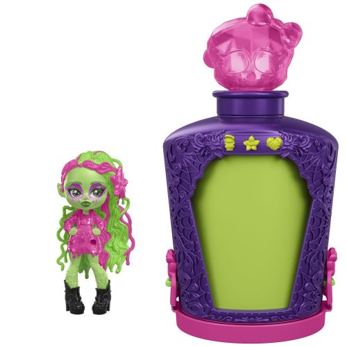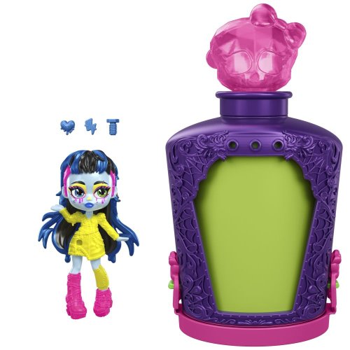 Darujte Monster High™ bábiku v desivej veľkosti! Stačí namiešať elixír a získate strašidelné prekvapenie. Herný set Monster High™ Elixíry s malou monsterkou obsahuje kúzelné fľaštičky s približne 7 cm veľkou figúrkou obľúbenej príšerky Monster High™ a tri "kúzelné" prívesky pre vlastnú zábavu! Uvarte lektvar v štyroch krokoch: do fľaštičky nalejte vodu a vložte do nej prívesky, pretrepte a sledujte, ako sa tvorí lektvar, vylejte zmes a potom odhaľte bábiku!