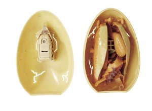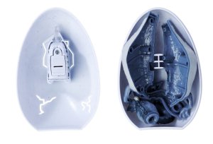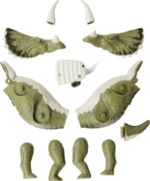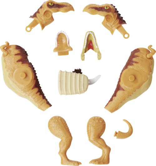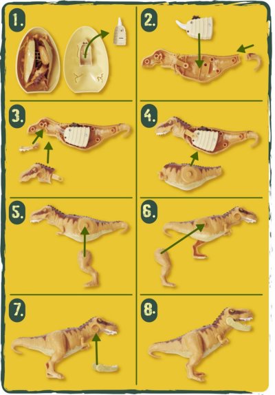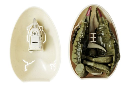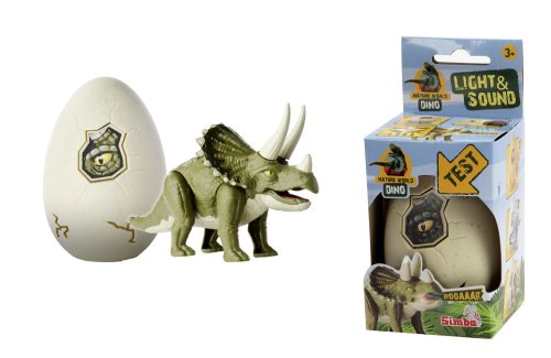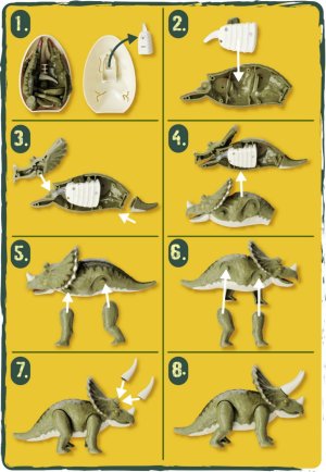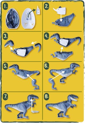 V každom vajci je schovaná figúrka dinosaura o veľkosti 14 cm, skladačka kostry dinosaura a návod. Dinosaurus svieti a vydáva zvuky, 3 druhy - T-Rex, Velociraptor, Triceratops.