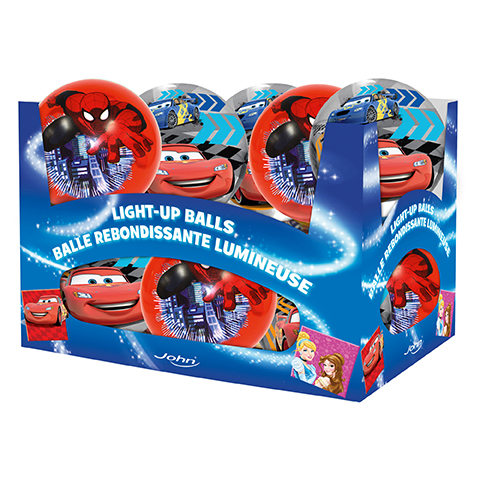 Detský kvalitný PVC loptu v licencii Cars a Spider-Man. Loptička s priemerom 10cm. Balené v display alebo samostatne. V display sú dva druhy. Lopta po hodení na zem alebo buchnutie svieti. Odporúčaný vek 3+