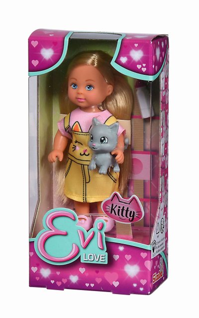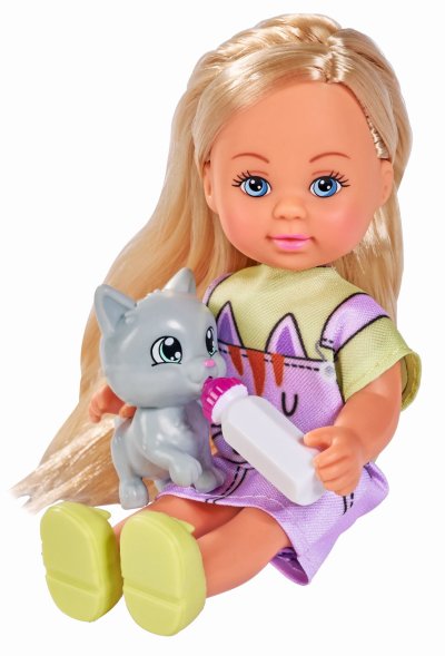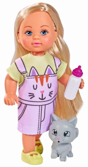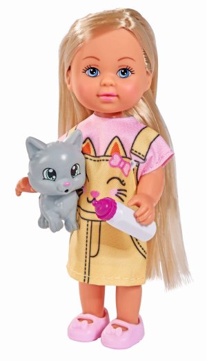 Bábika Evička v roztomilých mačacích šatách s mačičkou a fliaš na pitie. Veľkosť bábiky 12 cm.