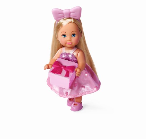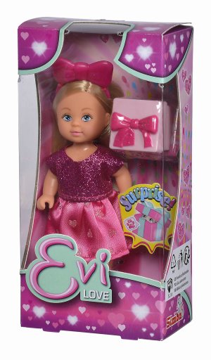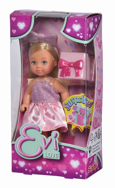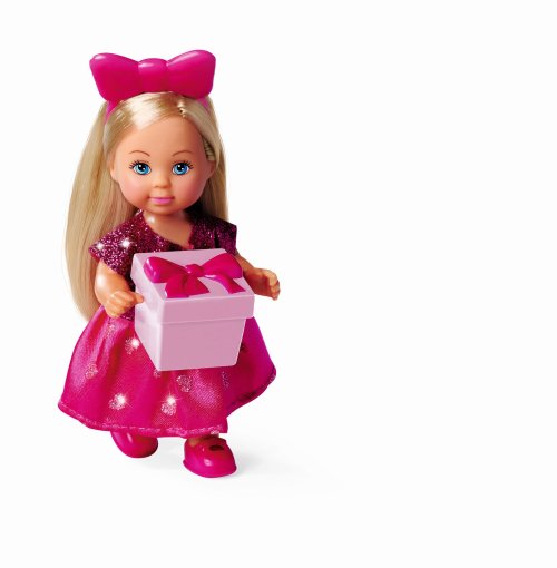 Bábika Evička v roztomilých trblietavých šatách s mašľou. Súčasťou je krabička s prekvapením, v ktorej je šteniatko. Veľkosť bábiky 12 cm.