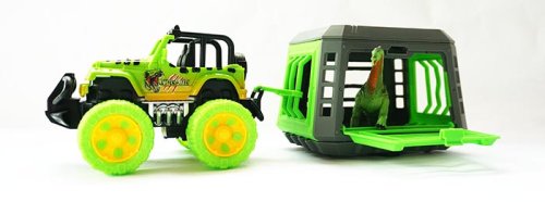 Jeep s prívesom a dinosaurom vyrobený z plastu. Dinosaurus je vyberací a príves odpojovací.