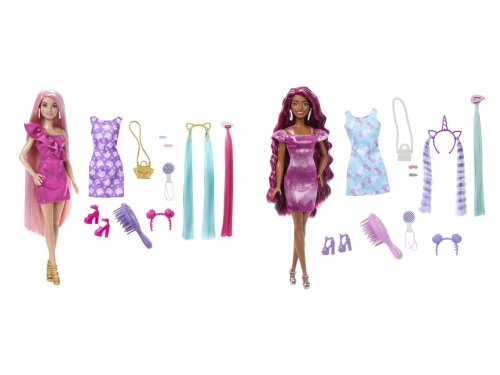 Kolekcia Barbie® Bábika s fantastickými vlasmi prináša úžasnú zábavu pre malé kaderníčky, ktoré môžu vytvárať farebné kombinácie účesov! Každá bábika má 21 cm dlhé, farebné vlasy s dúhovými odleskami. Deti si môžu vzhľad svojej bábiky prispôsobiť pomocou 10 módnych a vlasových doplnkov, vrátane ďalších šiat s potlačou, ďalšieho páru topánok a kabelky! Stylingové doplnky zahŕňajú čelenku a sponku s farebnými pramienkami vlasov, čelenku s drdolmi, sponky a gumičky do vlasov. Akonáhle deti dokončia svoje majstrovské diela vo forme účesov, môžu pomocou kefy vyčesať bábike Barbie® jej kadere a užiť si hodiny zábavy! Deti môžu ľahko premeniť jej vzhľad pomocou kombinácie módnych doplnkov a účesov - od vytvárania účesov a vrkočov, až po zdobenie farebnými prvkami, možnosti sú nekonečné! Každá bábika sa predáva samostatne v závislosti od dostupnosti. Bábiky nemôžu stáť samostatne. Farby a prevedenia sa môžu líšiť.