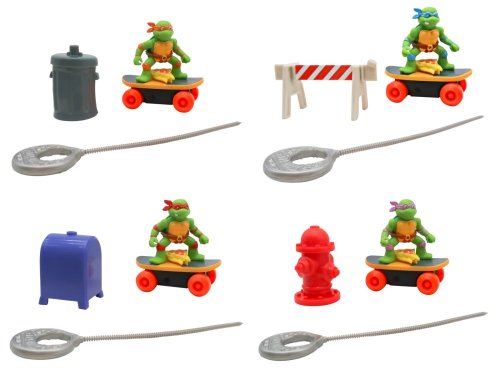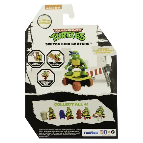Teenage Mutant Ninja Turtles Switch Kick Skaters je auto-stabilizačný skateboard, ktorý vám umožní predvádzať skvelé skate triky a zakaždým pristáť na všetkých štyroch kolesách. Auto-stabilizačný mechanizmus (gyro) vo vnútri skateboardu je napájaný naťahovacím lankom. Stačí zasunúť naťahovacie lanko do skateboardu, vytiahnuť a môžete začať vykonávať tie najlepšie triky so korytnačkami Ninja. Nazbierajte všetky 4 postavy – Leonardo, Michelangelo, Donatello a Raphaelo. Vhodné pre deti od 4 rokov.