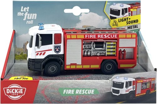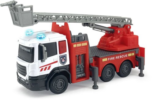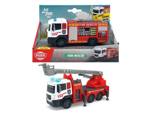 Hasičské auto na voľnobeh, svetelná a zvuková fnkcia, kovová kabína, pohyblivé časti. Dĺžka 17 cm. 2 druhy: s otváracím bokom alebo s výsuvným rebríkom.