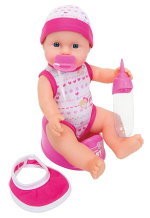 Bábika New Born Baby pije a ciká. Vhodná na kúpanie (pevné celé telíčko). Balenie obsahuje fľaštičku, cumlík, nočník a podbradník. Výška 30 cm.