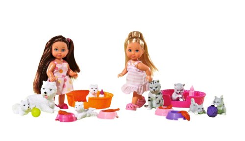 Bábika Evička s domácim miláčikom. Obsahuje 4 zvieratká a doplnky. So psíkmi alebo s mačičkami. Výška bábiky 12 cm.