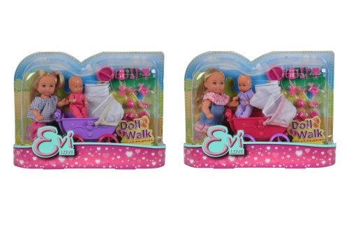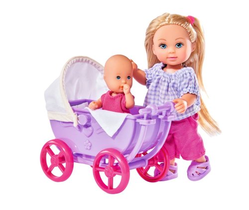 Bábika Evička na prechádzke s bábätkom. Kočík a ďalšie doplnky súčasťou. Výška bábik Evička 12 cm.