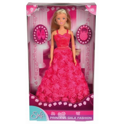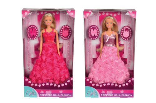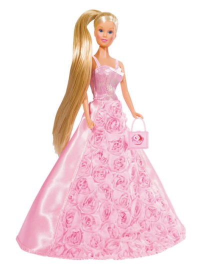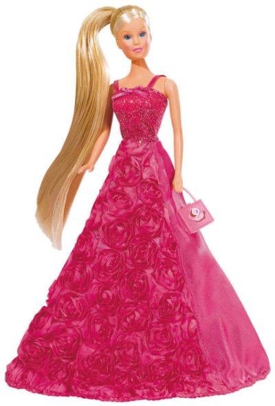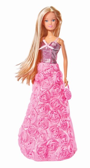 Bábika Steffi v nádherných šatách s ružami. Súčasťou kabelka aj hrebeň na vlasy. Výška bábiky 29 cm.