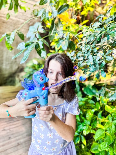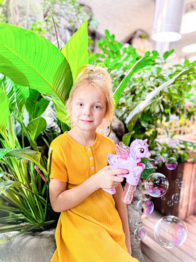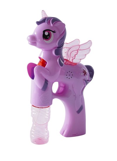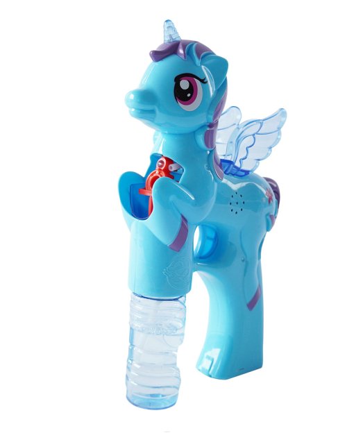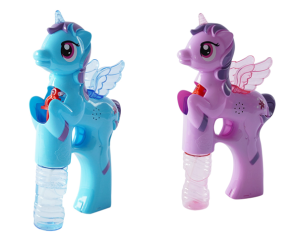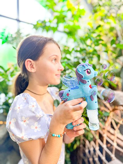 Bublifuk na batérie s jednorožcom. Jednoduchým stlačením spúšte deti vytvoria záplavu bublín. Pri tvorbe bublín jednorožec hrá.