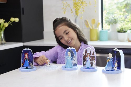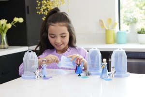 Táto kolekcia malých bábik s prekvapeniami ponúka inovatívny zážitok pri rozbaľovaní vďaka Squishy Ice™ - ľadovo modrej želé zmesi. Deti sa pomocou priloženej lopatky prehrabu nádobkou so Squishy Ice™ a objavia poklady vo vnútri: malú bábiku Annu alebo Elsu, postavičku kamaráta a 4 hracie prvky.