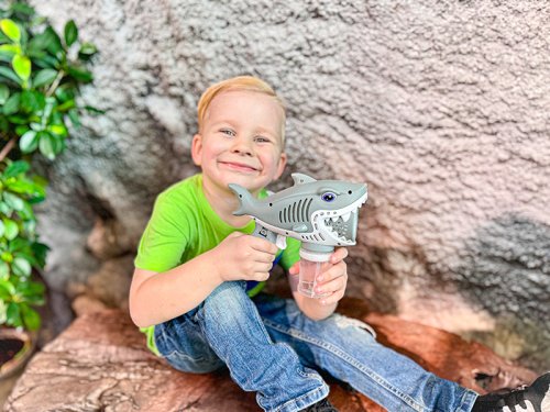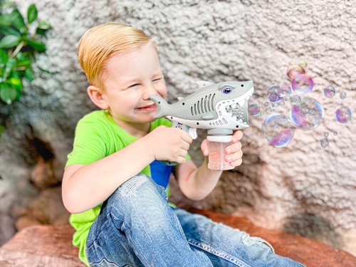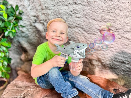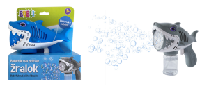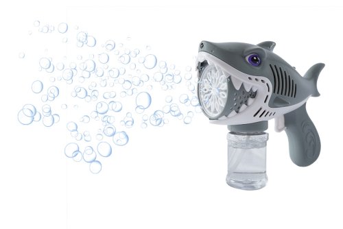 Predstav si plastovú pištoľ, ktorá má tvar roztomilého, ale zároveň trochu divokého žraloka. Telo žraloka tvorí hlavnú časť pištole, takže ho držíš v ruke. Jeho široká papuľa je otvorená a práve z nej vylietajú bubliny.