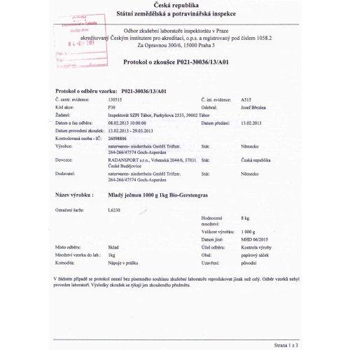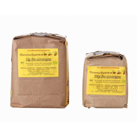 Mladý jačmeň od firmy Bienenschwarmmm v najvyššej bio kvalite za bezkonkurenčnú cenu! Výroba na nemeckých farmách je neustále kontrolovaná a certifikovaná podľa nemeckej ekologickej smernice eko-DE-006, produkcia sa riadi normou ISO 9001:2000. Zberajú sa mladé rastliny veľkosti 20 až 25cm, pretože v tejto prvotnej fáze rastu vykazujú najvyšší obsah aktívnych zložiek. Vylisovanie a sušenie prebieha pri teplote do 35 ° C, to znamená, že všetky cenné vitamíny a enzýmy zostávajú nedotknuté. Vznikne tak 100% čistý a nepasterizovaný prášok. Prášok udržujte v úplnom suchu, pri izbovej teplote av tme. Doba expirácie sú 3 roky. Odporúčame užívať ráno nalačno a večer pred spaním, v prípade práškového balenia rozmiešať vždy čajovú lyžičku extraktu do 2dcl vody (max. teplota 35 ° C), v prípade tabletového balenia je odporúčané dávkovanie pre mužov okolo 5 gramov (12-13 tabliet), pre ženy cca 4 gramy (tmavá stolica – nestrávený chlorofyl je indikátorom správneho dávkovania). Pri chorobe, únave alebo zlom jedálničku môžete dávky zvýšiť až na 20 gramov, zelené biopotraviny nemôžu škodiť. Odporúčame užívať 30 minút pred jedlom alebo 2 hodiny po jedle, vhodné je poberať súčasne s riasou chlorella, efekt sa tým zvyšuje. Extrakt zeleného jačmeňa má vysoký obsah betakaroténu, vitamínu C,E a vitamínov B1,B2,B3,B6, biotínu, kyseliny listovej, kyseliny pantoténovej a cholínu, obsahuje viac ako 20 enzýmov a štúdie odhaľujú ďalšie. Obsahuje napr. enzým SOD, ktorý spomaľuje bunkové starnutie a má protirakovinové účinky, enzýmy cytochrómoxidázy napomáhajú k lepšiemu spaľovaniu tukov (pomoc pri nadváhe), enzýmy v extrakte z trávy sú účinné proti ukladaniu pigmentu, melanóze a uhrovitosti. Vďaka vysokej koncentrácii chlorofylu a minerálov (hlavne draslík, železo) je zelený jačmeň odporúčaný ako účinný proti zápche a chudokrvnosti.