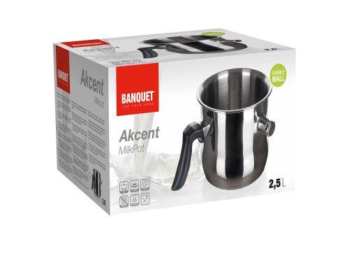 Nerezový mliekarník AKCENT. Je dvojstenný, z kvalitnej nerezovej ocele s píšťalou. Nádobu otvorom pre píšťalu naplníte vodou. Píšťalka pri dosiahnutí bodu varu začne pískať. Mliekovar je tak ideálny na varenie pokrmov, ktoré sa ľahko pripaľujú ako mlieko, puding, krupicová a iná kaša, omáčka, čokoláda. Píšťalka upozorní na vriacu sa vodu vo vnútri - mlieko a ďalšie pokrmy sa tak vlastne varí vo vodnom kúpeli a nemajú tendenciu sa tak rýchlo pripaľovať.