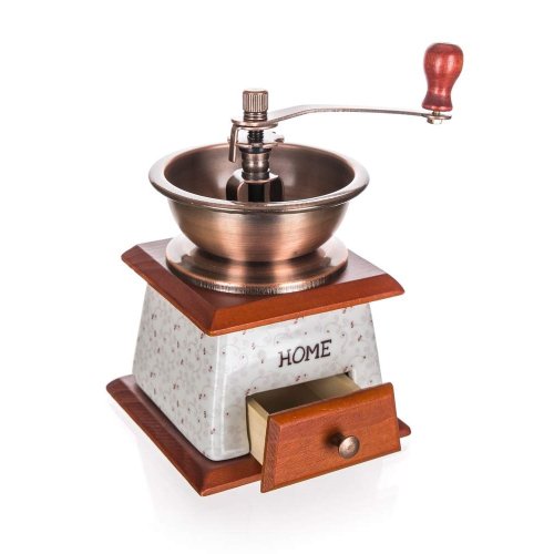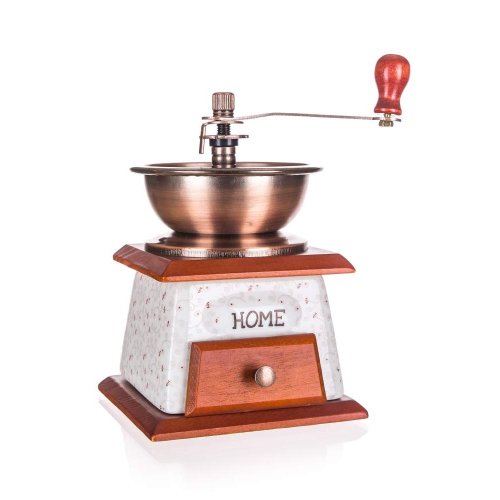 Ručný mlynček na kávu HOME s keramickým mechanizmom, dekorované keramické telo s drevenými doplnkami a kovovou násypkou. Keramickú mleciu mechaniku je možné nastaviť na požadovanú hrubosť mletia.