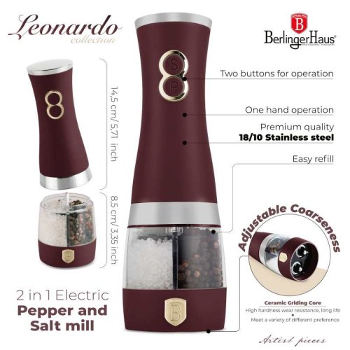 Tento elektrický mlynček 2 v 1 v matnej bordovej farbe kombinuje elegantný dizajn a maximálnu praktickosť. Umožňuje mletie korenia aj soli v jednom tele pomocou samostatných tlačidiel, takže ušetrí miesto a prináša pohodlie pri každodennom varení. Je vybavený nastaviteľnými keramickými čepeľami pre individuálnu voľbu hrubosti mletia a jednoduchým ovládaním jednou rukou.